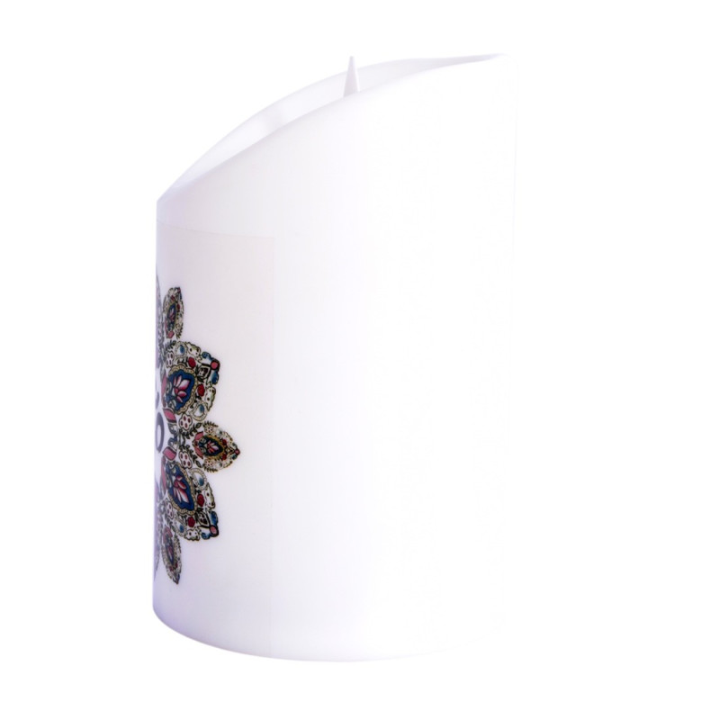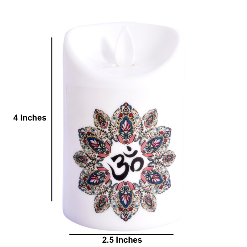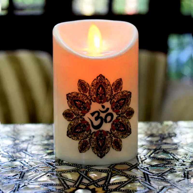Flameless, battery operated candle with a moving wick to give it a real feel. Image of OM enhanced in yellow light. Must Check Video.