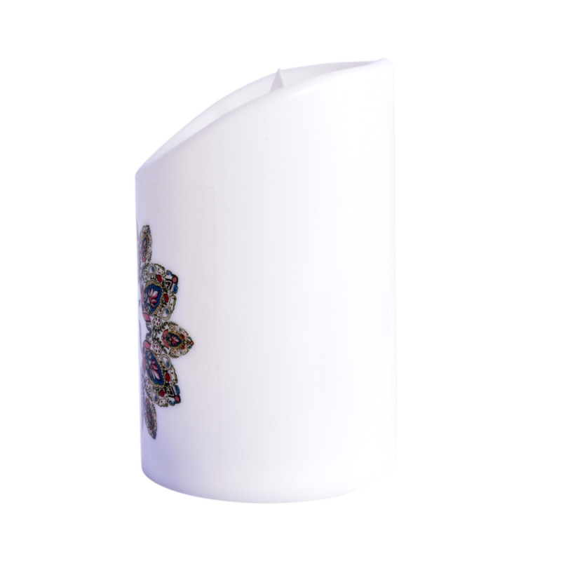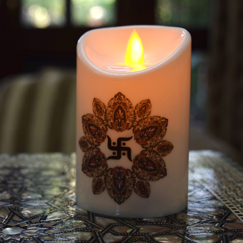 Flameless, battery operated candle with a moving wick to give it a real feel. Image of Swastik enhanced in yellow light. Must Check Video.