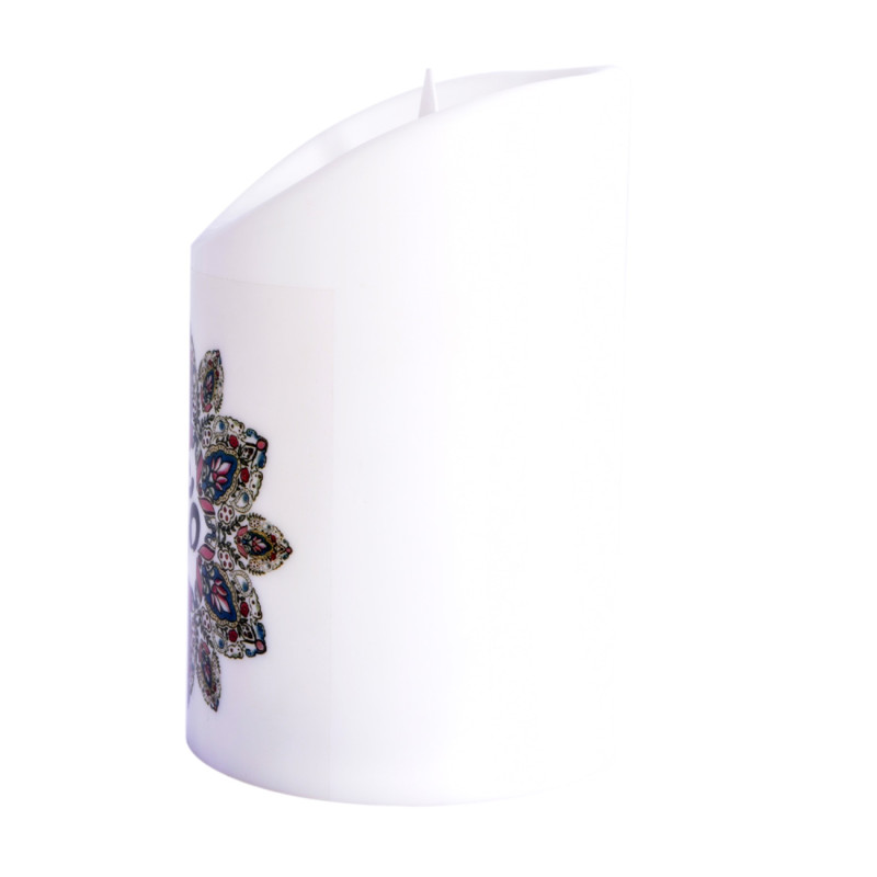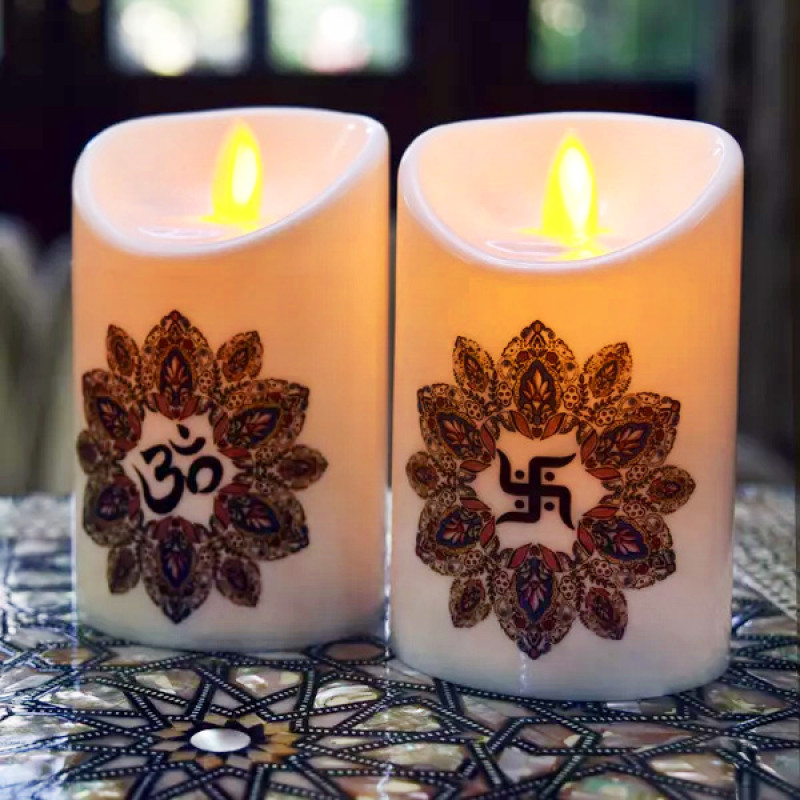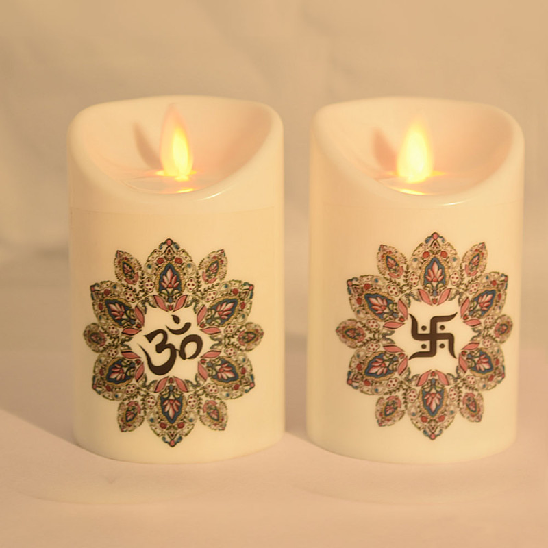 Flameless, battery operated candle with a moving wick to give it a real feel. Image of Om & Swastik enhanced in yellow light. Must Check Video.