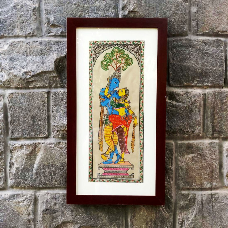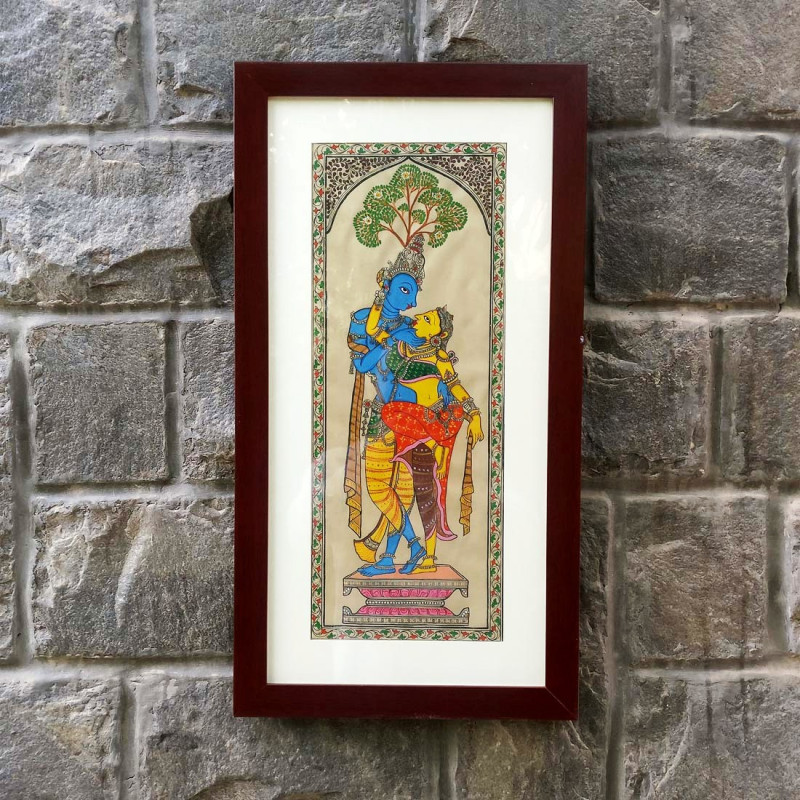 This stunning workmanship has been hand-painted with Pattachitra Radha Krishna craftsmanship on Tussar silk.