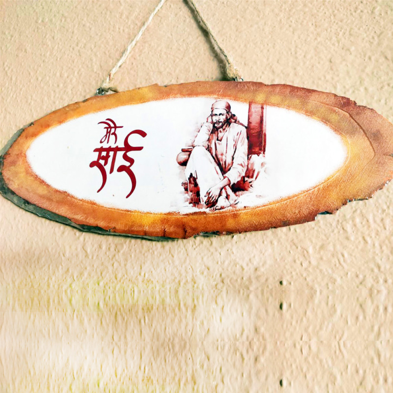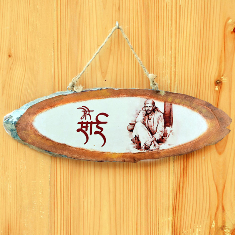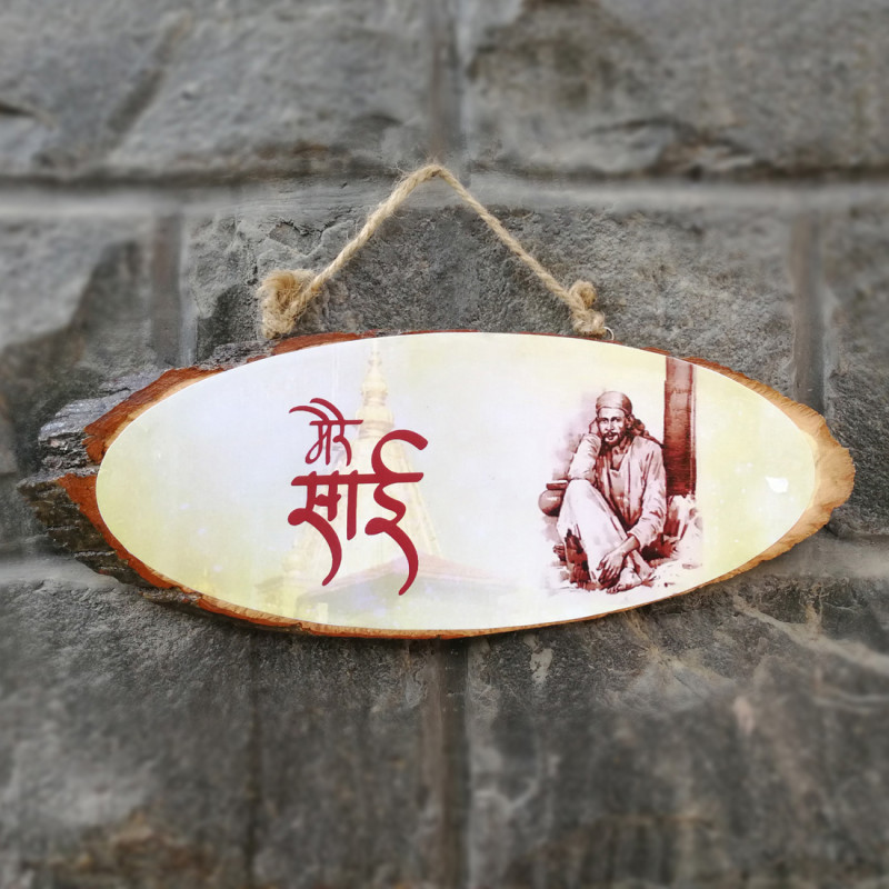 "Mere Sai" lettering on a slice of wood, which adopts wood with fine polishing on both sides. It features oval design with a hanging jute rope attached between two hooks. These natural wooden discs are surrounded with bark, A naturally beautiful craft you can choose to have as an ornament, hanging, or just as is!