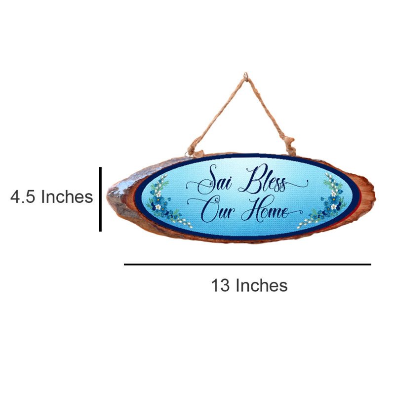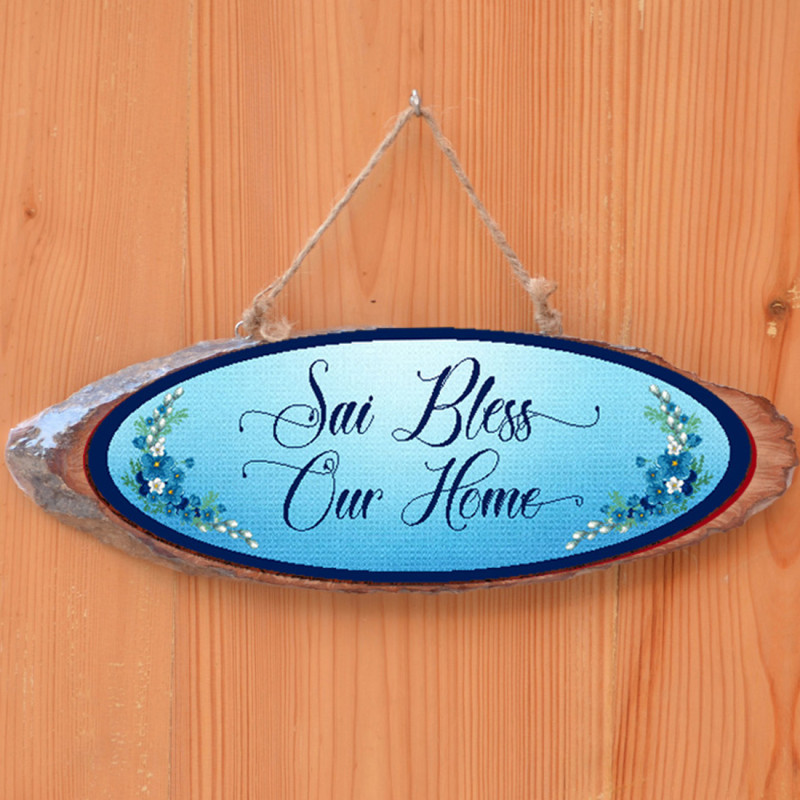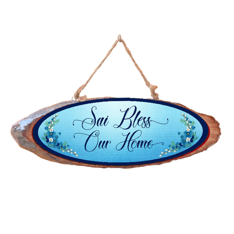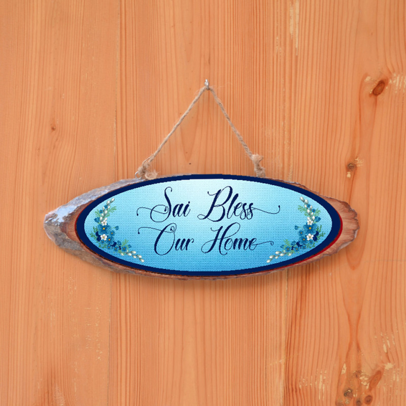 "Sai Bless Our Home" lettering on a slice of wood, which adopts wood with fine polishing on both sides. It features oval design with a hanging jute rope attached between two hooks. These natural wooden discs are surrounded with bark, A naturally beautiful craft you can choose to have as an ornament, hanging, or just as is!